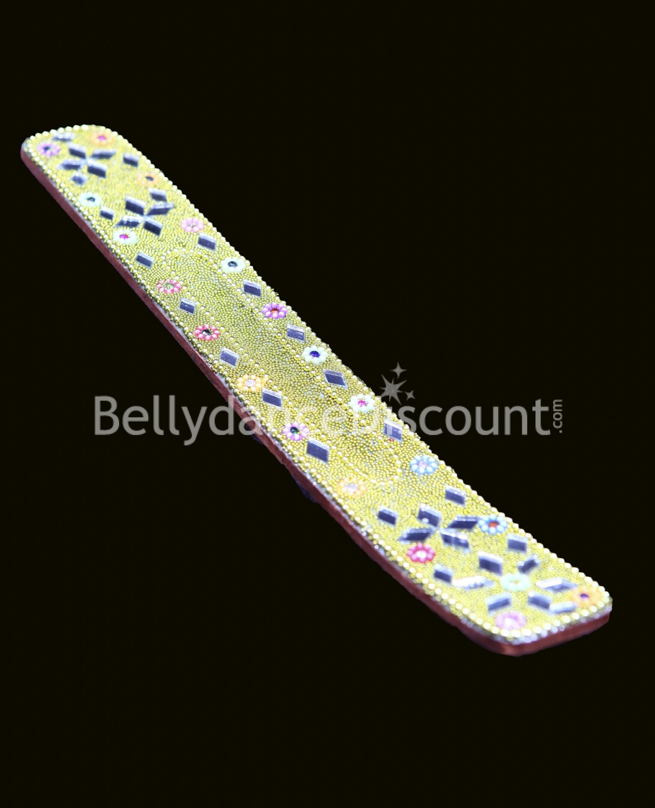 Struktur aus Holz verziert mit indischen Motiven aus Perlen und Pailletten.