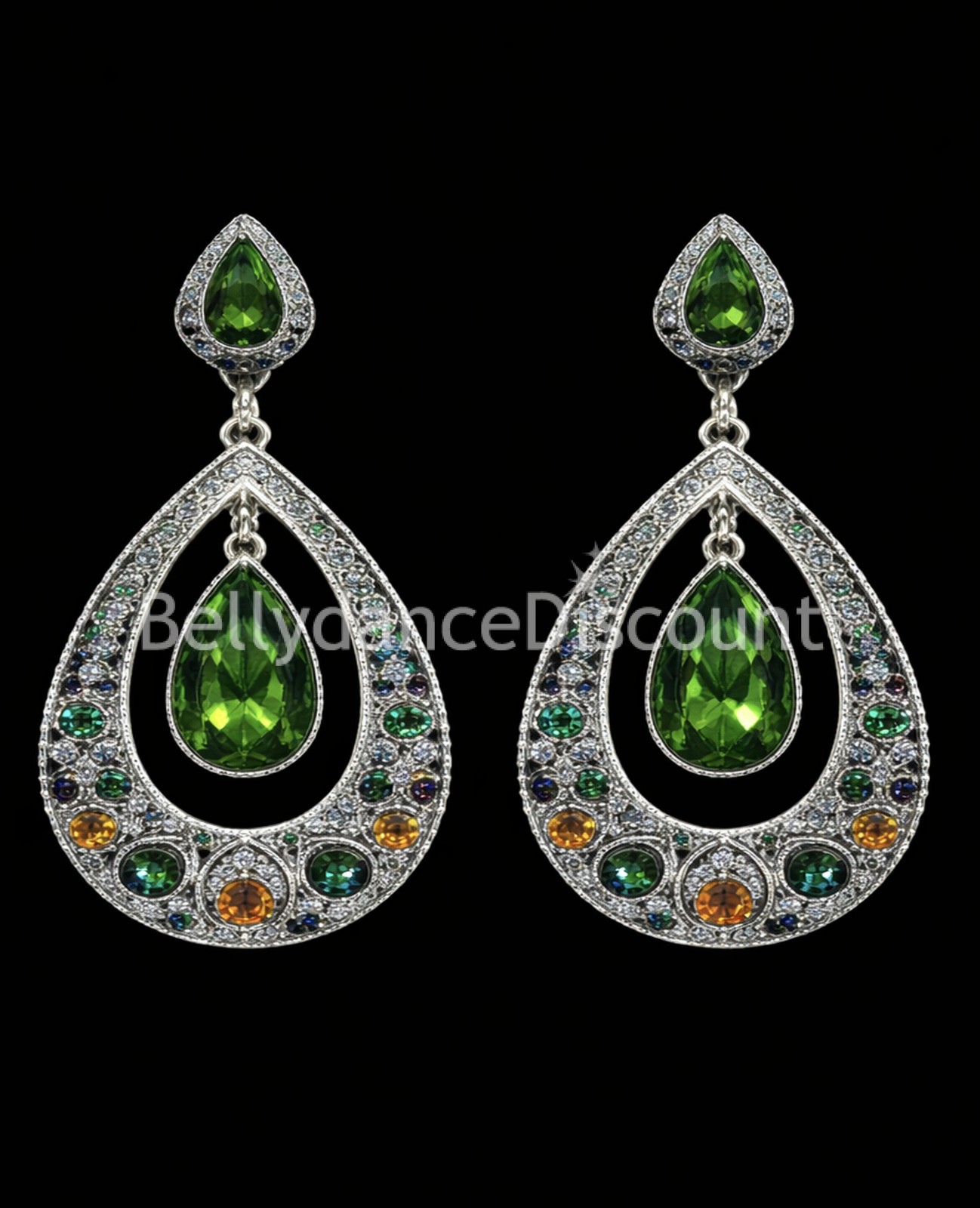 Fantasievolles Paar Ohrringe aus silbernem Metall, fein geformt aus hübschen orientalischen Motiven und Strukturen wie Arabesken. Dieses schöne Schmuckstück beinhaltet unter anderem Strass und bunte Perlen, für einen extrem eleganten Kontrast von Farben und Materialien, welcher sich einfach mit Ihren Bühnen- oder Cityoutfits vermählt.