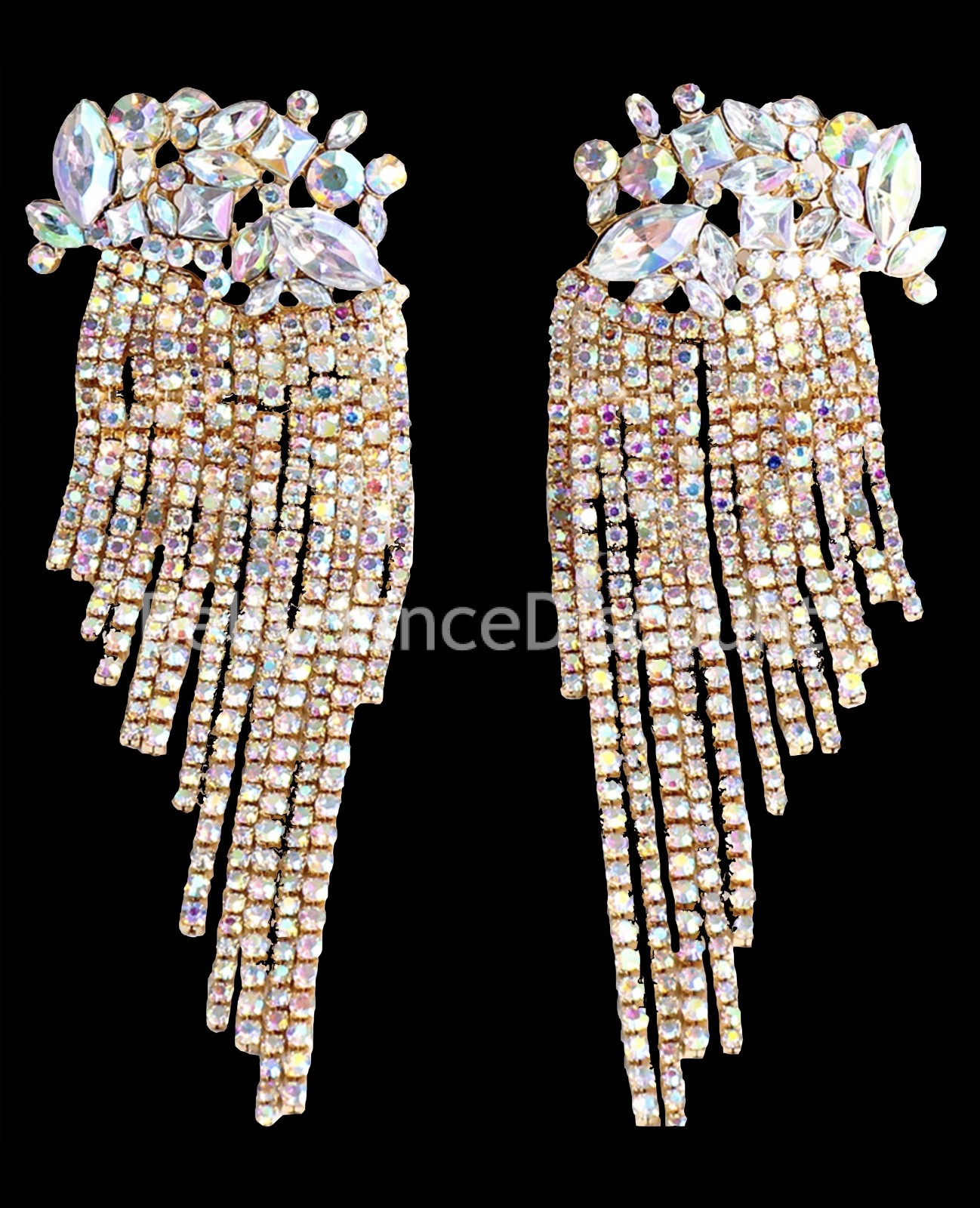 Traumhaftes Paar Ohrringe, für Ohren mit Ohrlöchern gedacht, welches eine Vielzahl an Strasssteinen unterschiedlicher Art verbindet: Zunächst einmal große Strasssteine in unterschiedlichen Formen im oberen Bereich, dann fallende Strass-Netze im unteren Bereich, welche sich mit jedem Tanzschritt bewegen, für noch mehr optische Intensität.