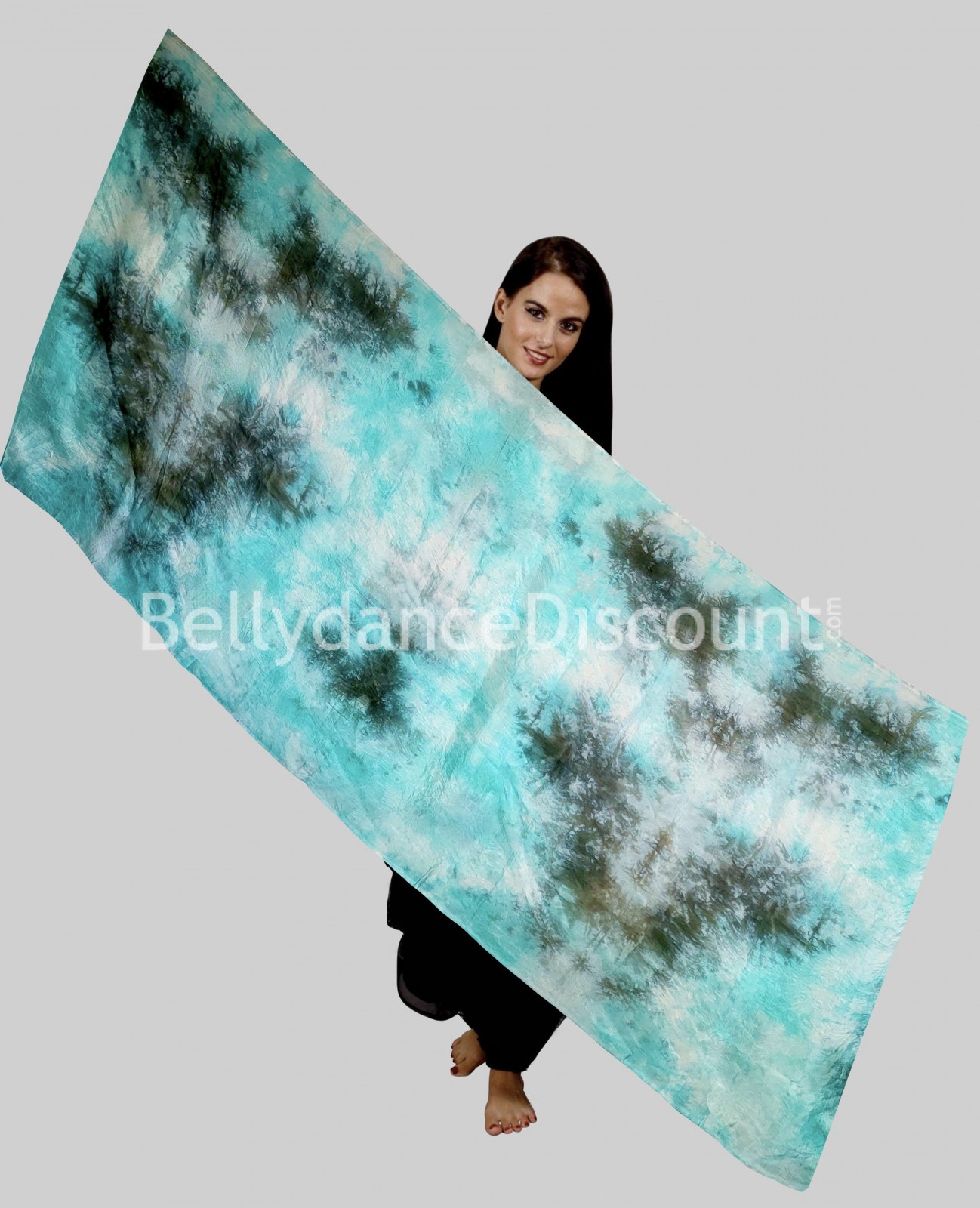 Der leuchtend türkisfarbene Aufdruck mit Sprenkeln in Schwarz, Weiß und Grau passt gut zu Ihrem Bühnenoutfit und nimmt Ihr Publikum sofort mit auf eine erstaunliche Reise ins Herz des Orients.