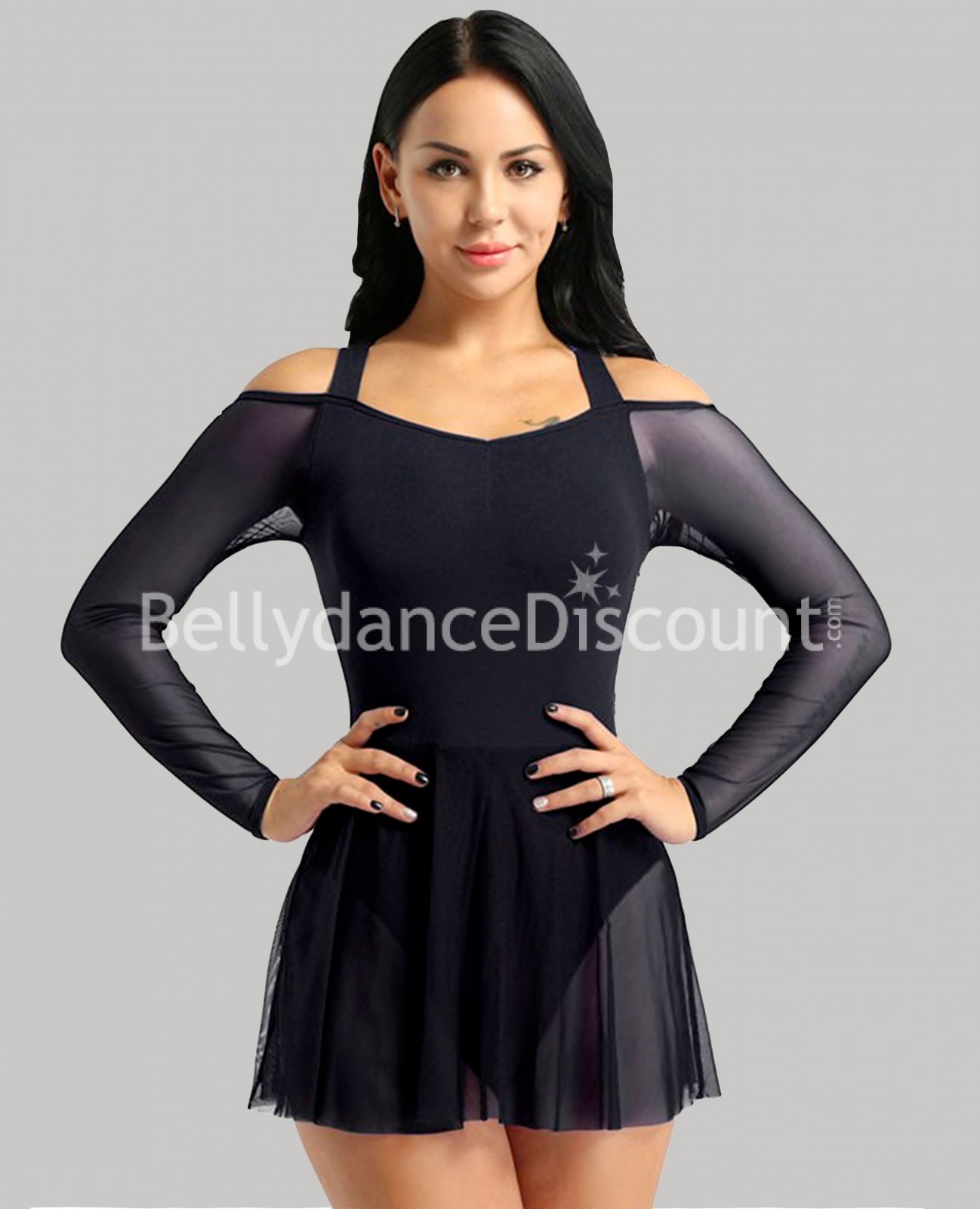 Wunderbarer Body opak in Schwarz ausgestattet mit langen durchsichtigen Ärmel und einem ebenfalls durchsichtigen luftigen Röckchen.