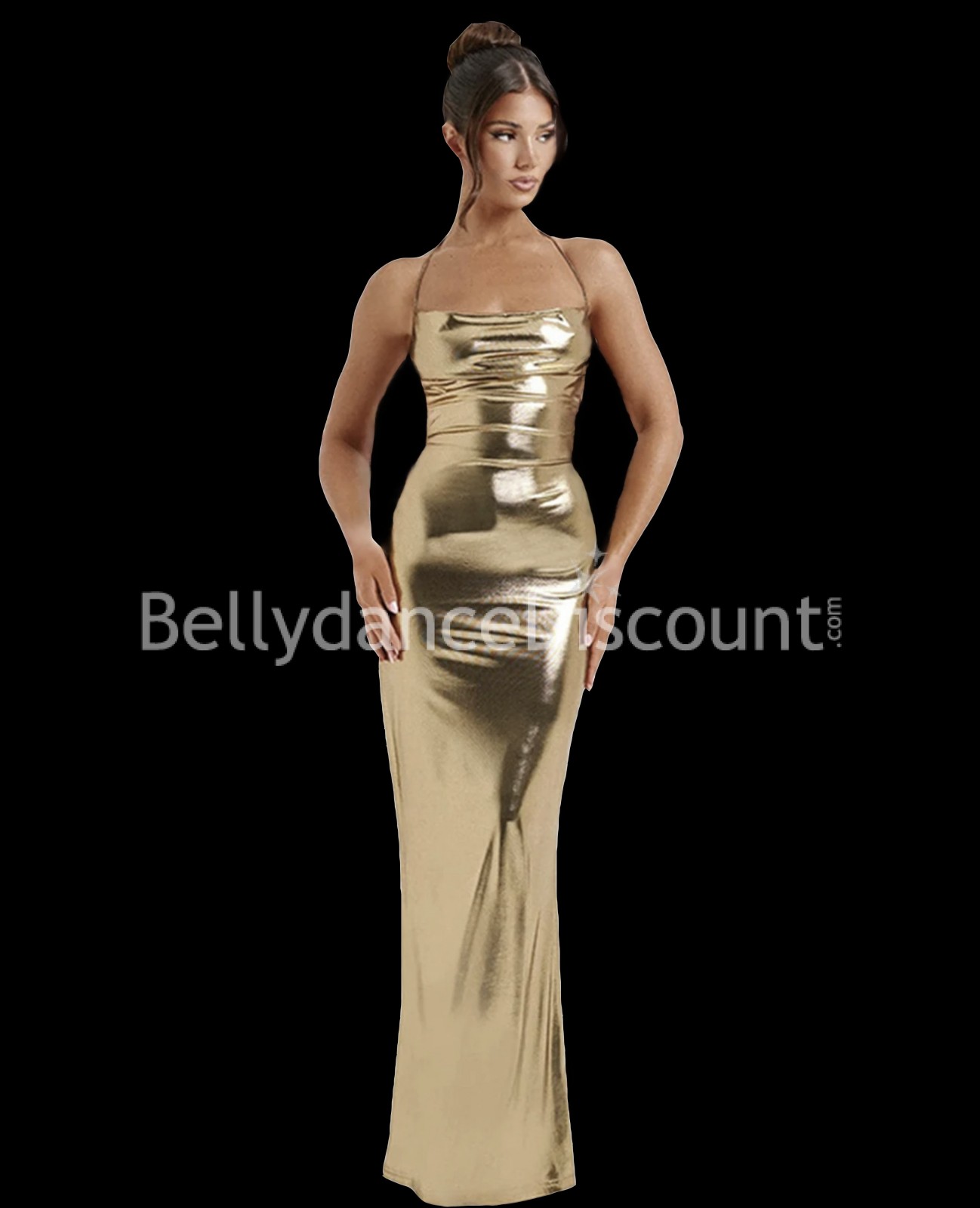 This dress is made in metallic lycra and ties in the back and neck to fit everyone's body shape. Very stretchy and comfortable, it will beautifully hug your figure while giving you complete freedom of movement. It will also catch the light in an incomparable and unparalleled way.