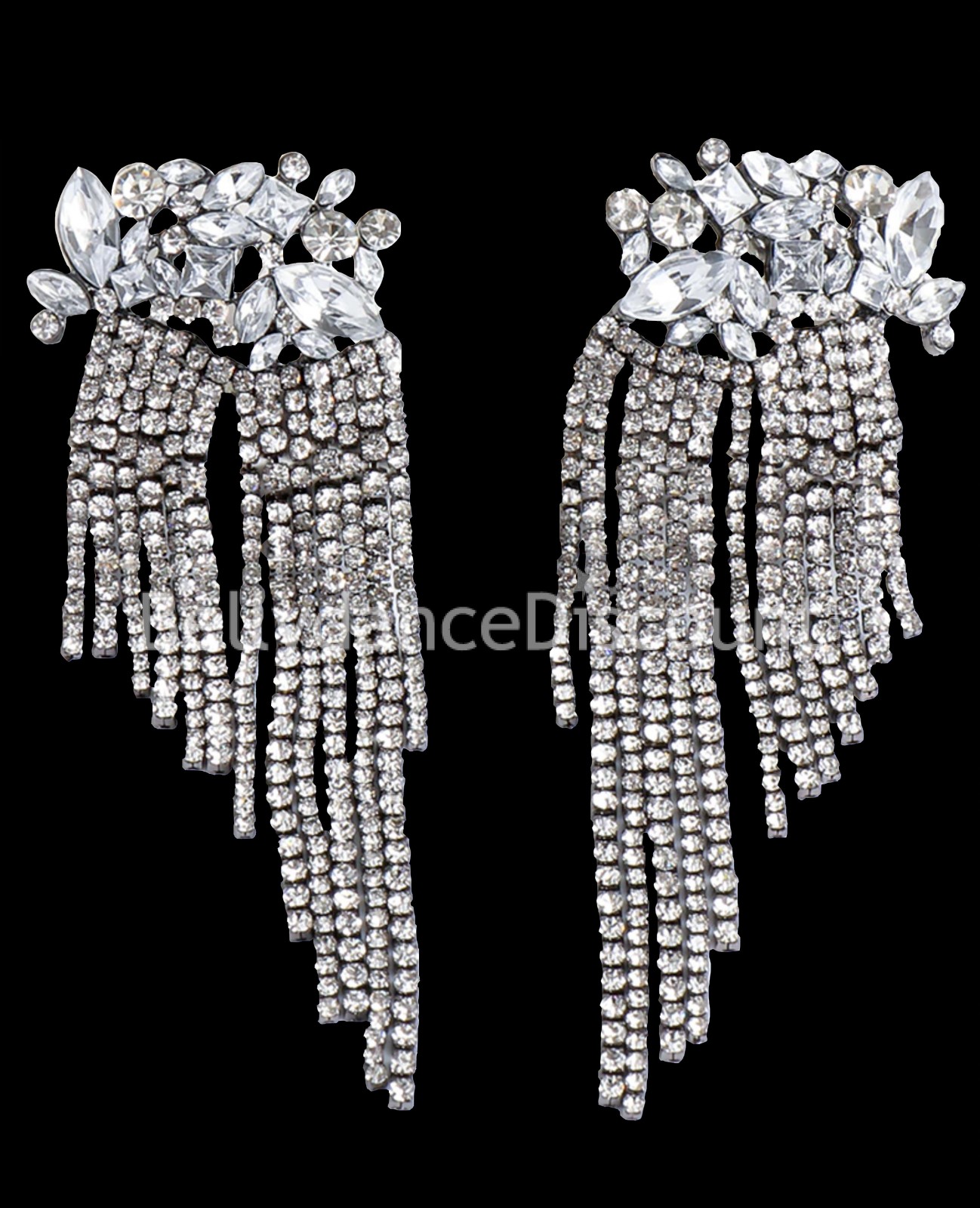 Beautiful pair of earrings for pierced ears, combining many rhinestones of different kinds. First of all large rhinestones in various shapes on the upper part then falling rhinestone nets on the lower part which will move with each dance step for even more visual intensity.