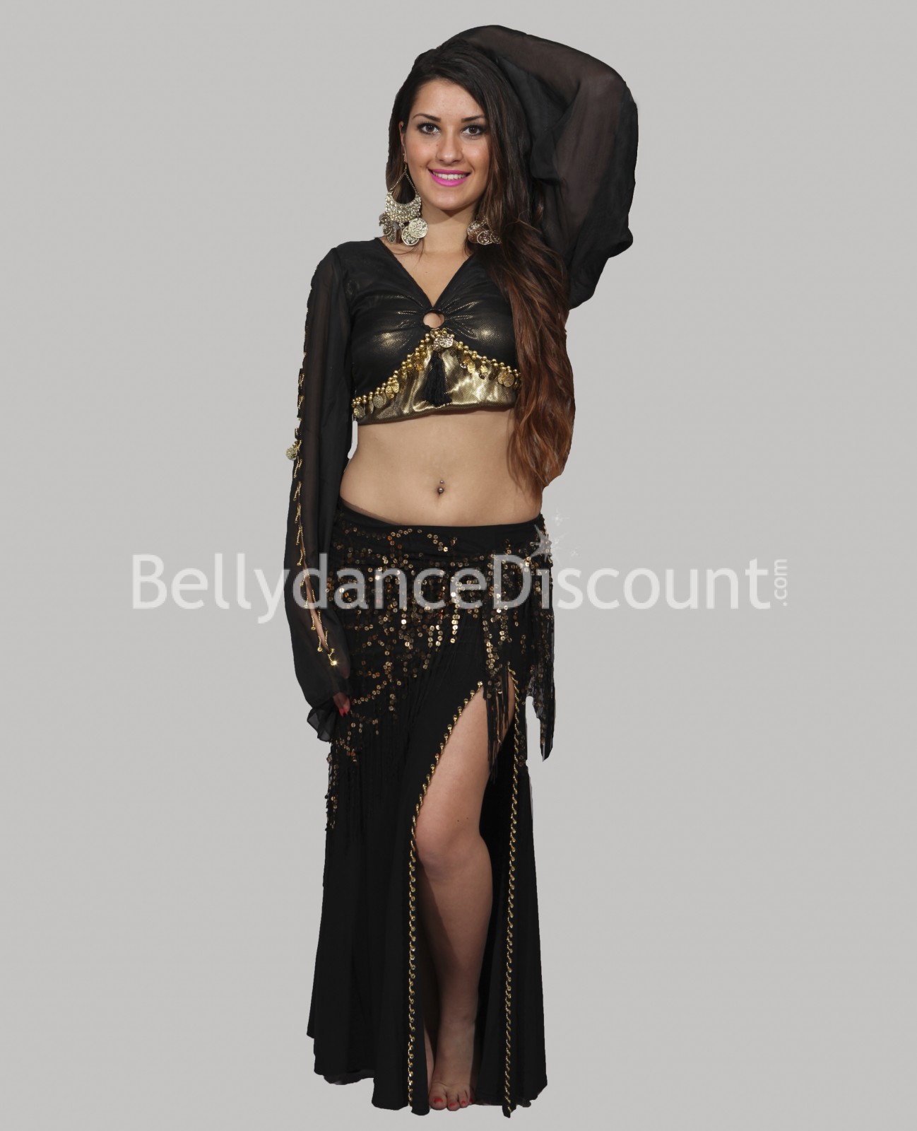 To make your dance, staging, and Bellydance costume more beautiful, choose this shiny black and gold Bellydance veil!