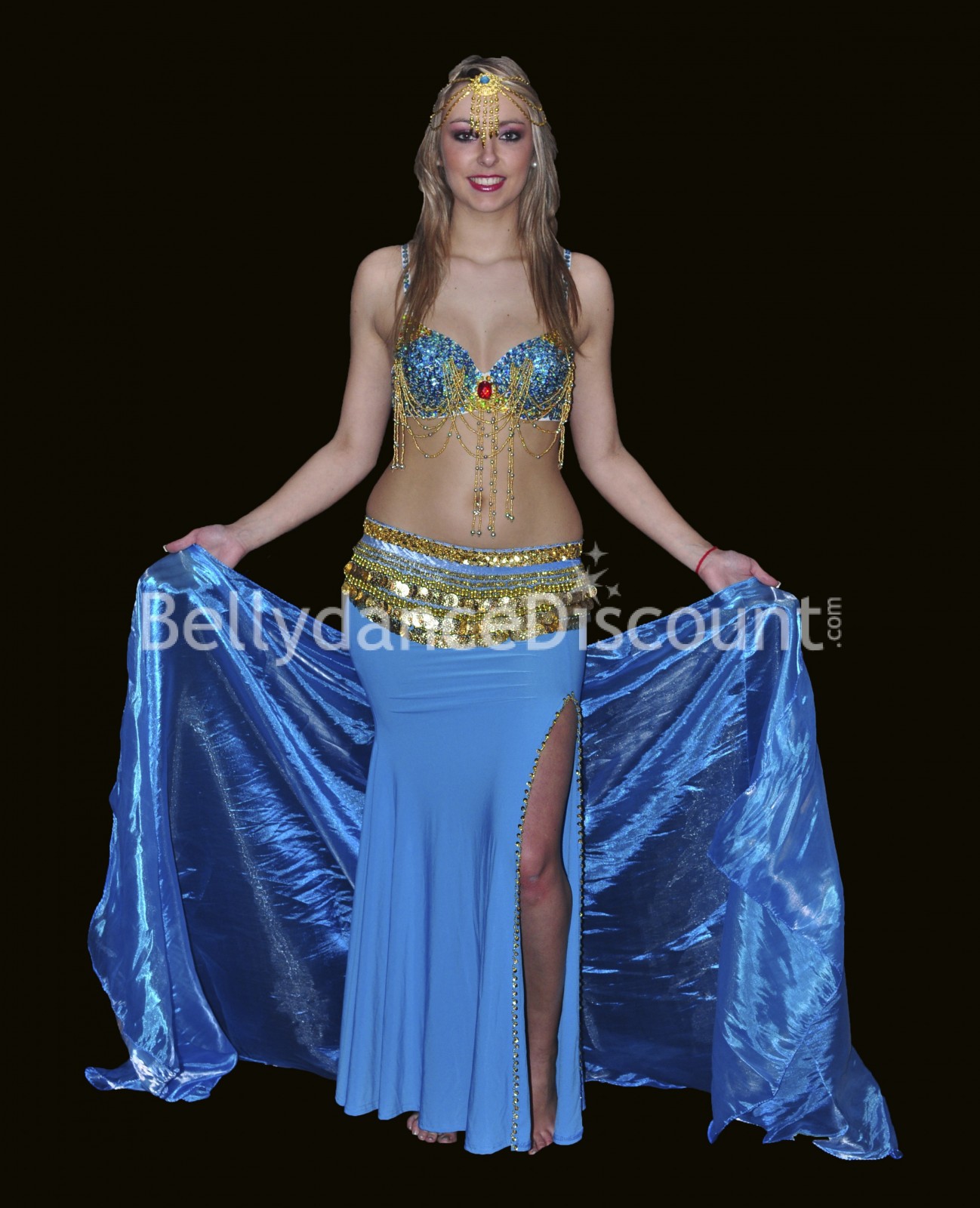 Déjese seducir por este magnífico cinturón azul claro para danza del vientre de lentejuelas doradas, a un precio de ocasión.