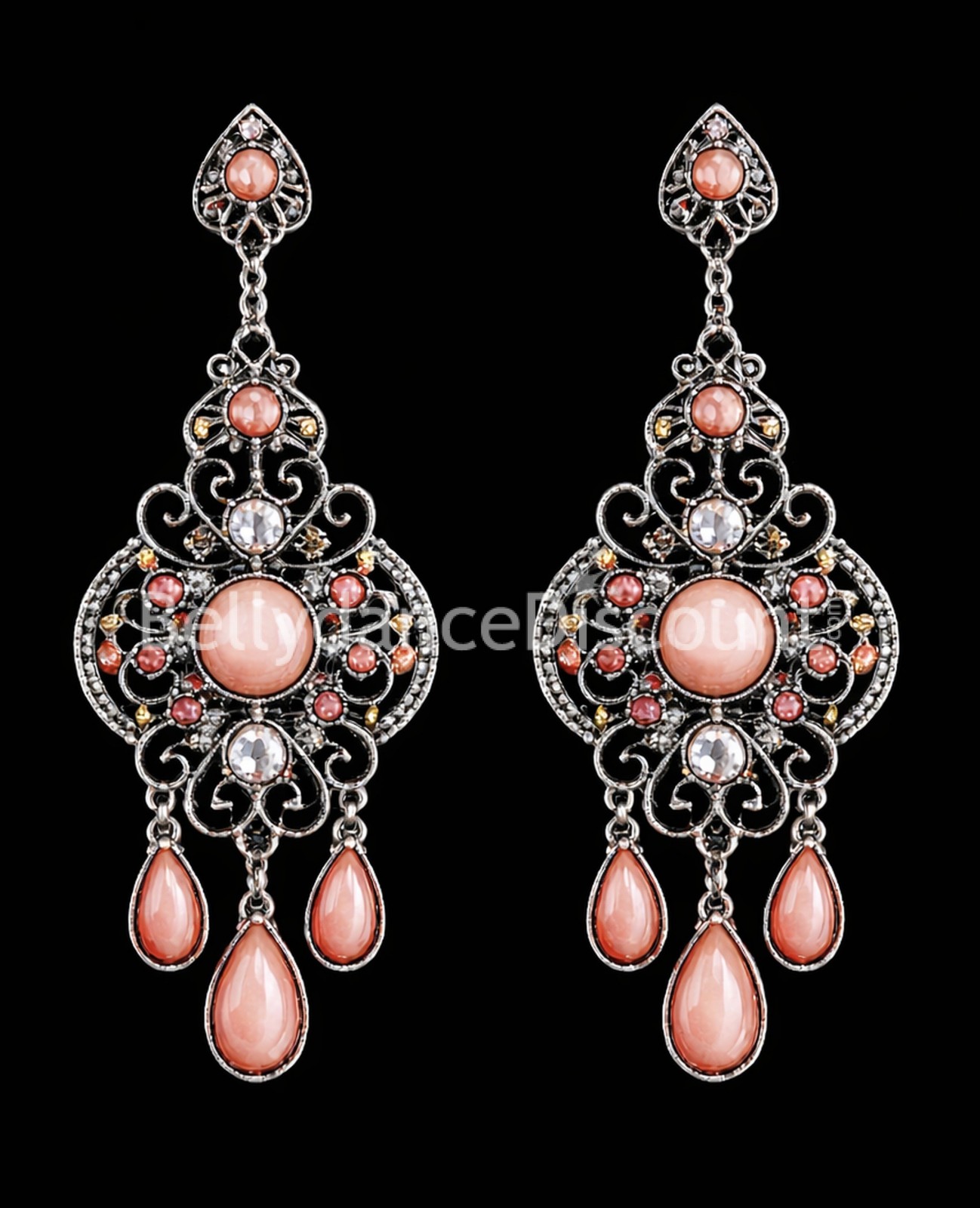 Par de pendientes de fantasía en metal plateado finamente tallado con lindas formas y motivos orientales como los arabescos. Esta hermosa joya también tiene brillantes y perlas de colores para un contraste de tonos y materiales muy elegante, que se combina fácilmente con sus trajes de escenario o de ciudad.