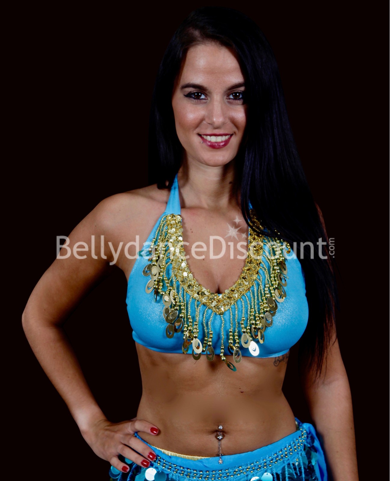 Enamórese de las numerosas virtudes de este top de danza del vientre azul claro ideal para el escenario y los espectáculos…