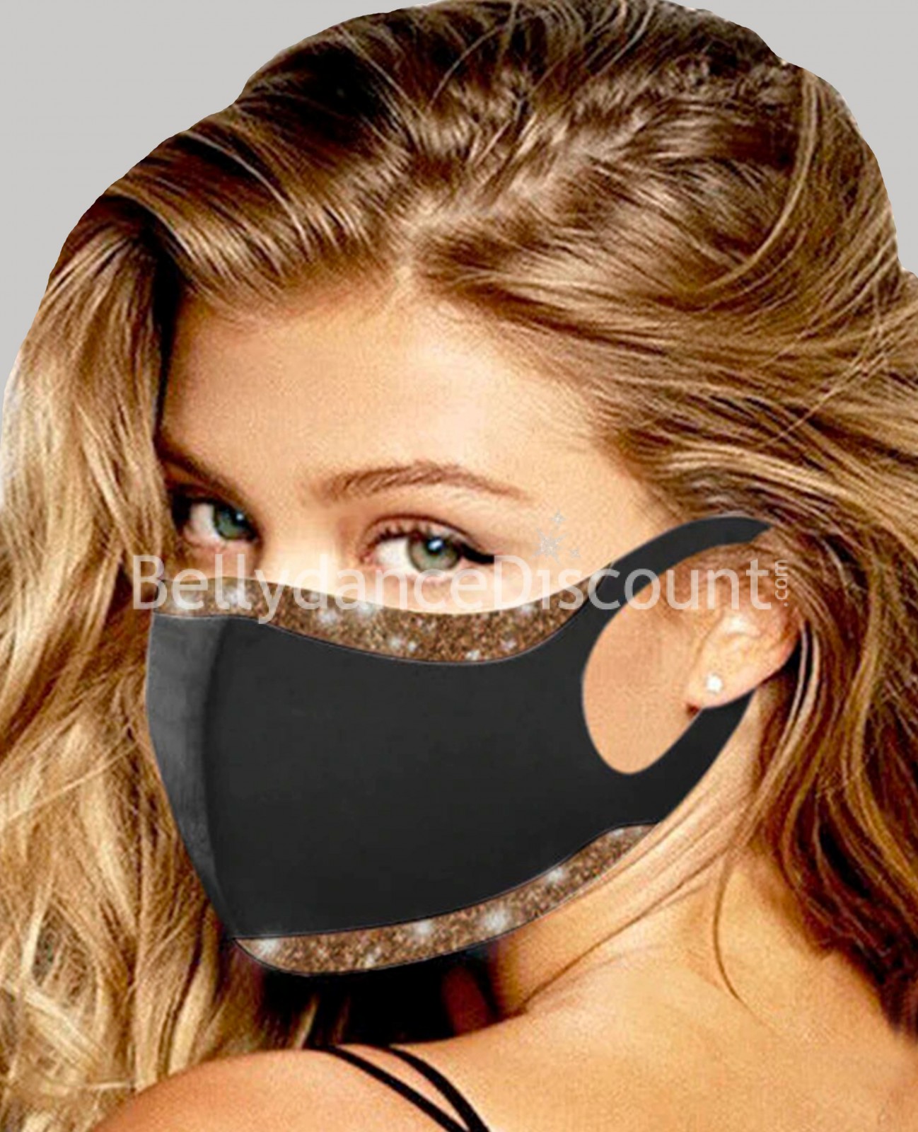 Superbe masque de protection pour le visage en lycra extensible noir, à fixer derrière les oreilles. Il est sobrement décoré de 2 bandes pailletées cuivrées pour s’accorder discrètement et joliment à votre costume de scène.