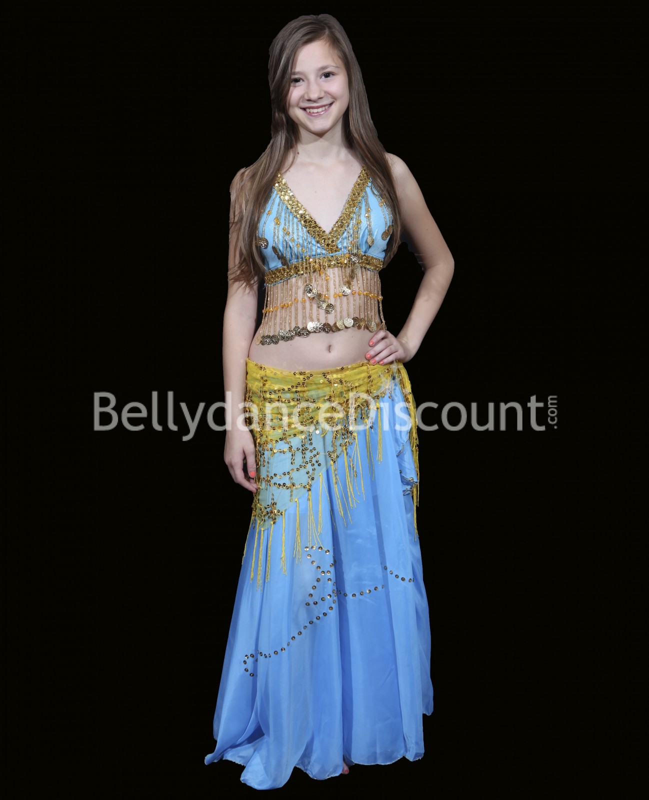Pour une tenue flamboyante, optez pour ce magnifique top enfant de danse orientale bleu ciel et doré, à prix discount !
