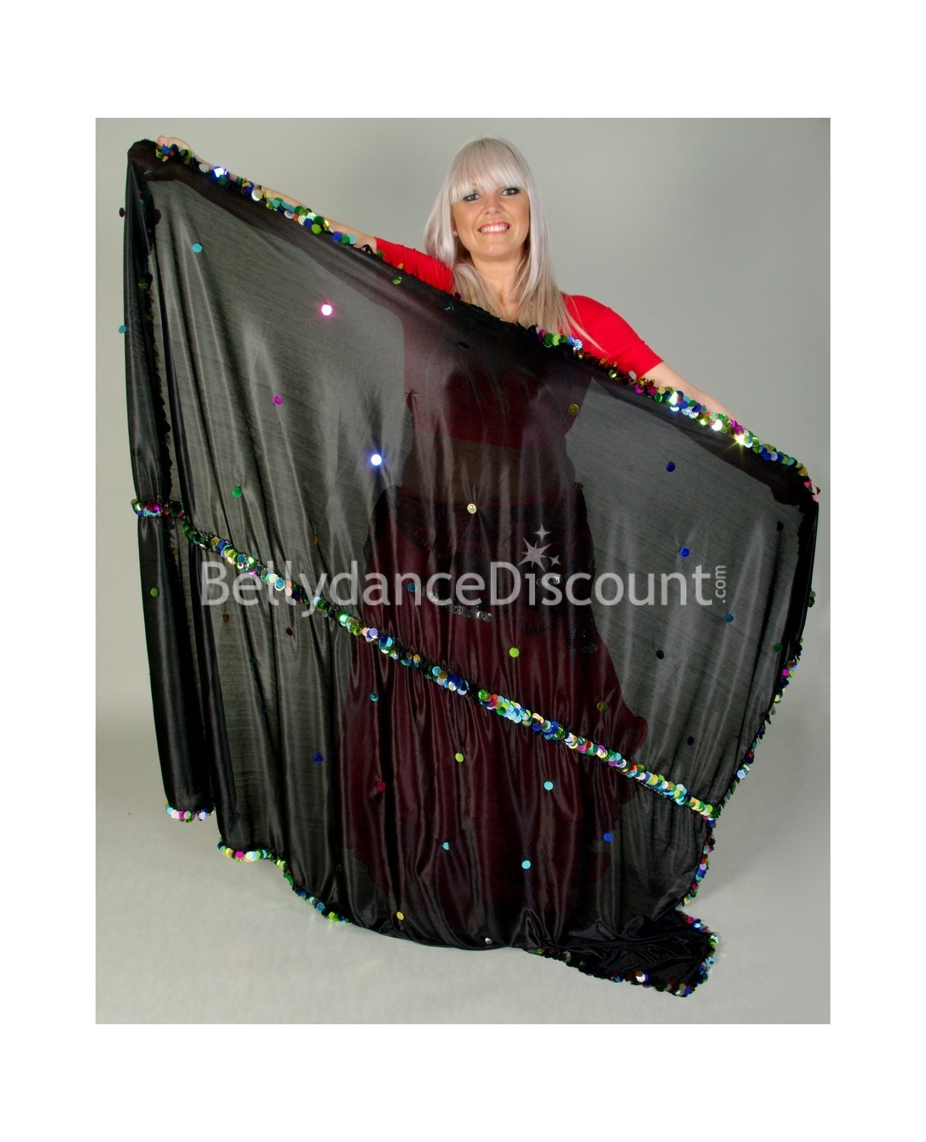 Grand châle noir fluide et très agréable à danser, fabriqué de manière artisanale en Égypte, et décoré de nombreux sequins principalement positionnés sur le pourtour du tissu et la ligne centrale.
