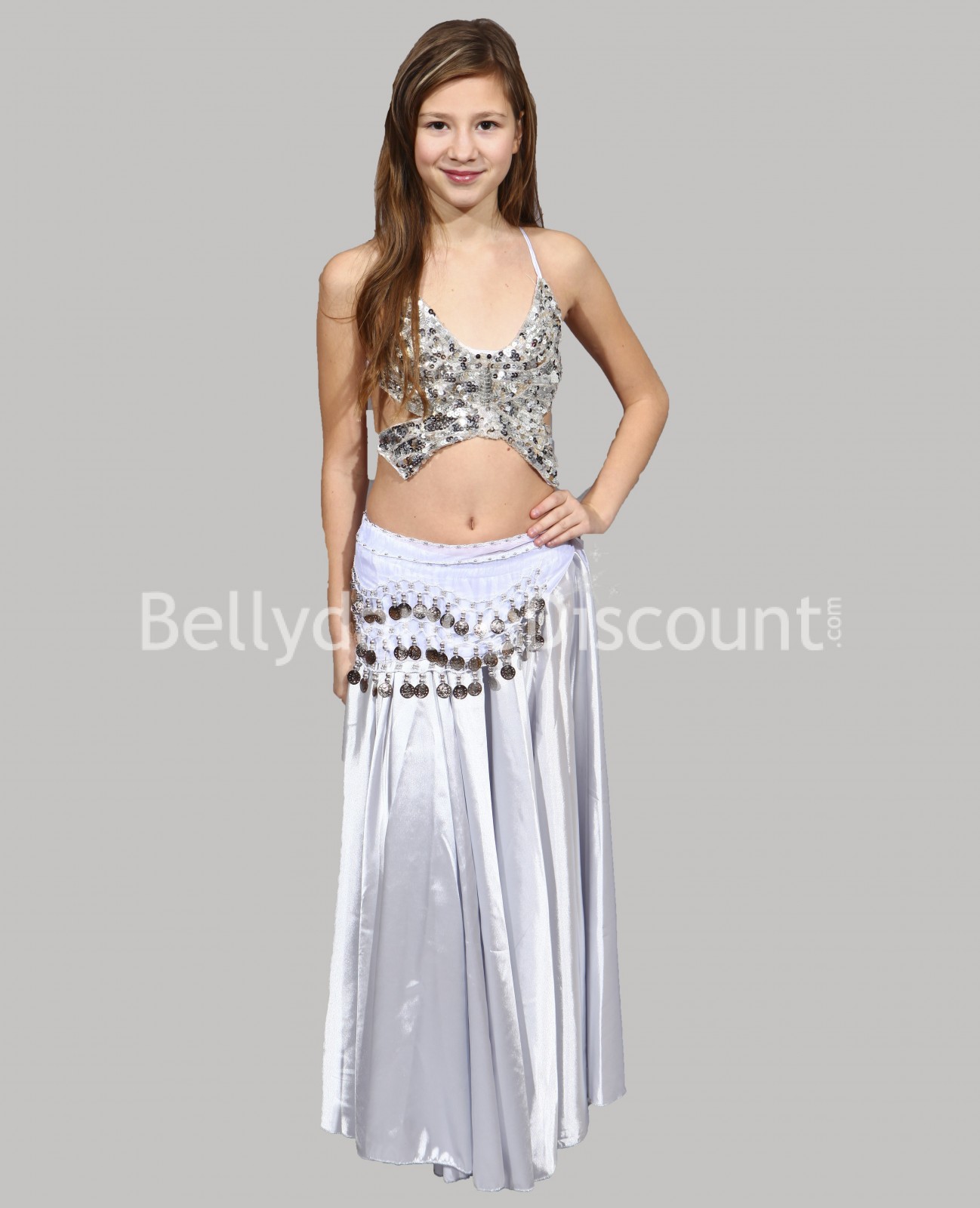 Laissez-vous séduire par cette magnifique ceinture enfant de danse orientale blanche à sequins argentés, affichée à prix craquant!