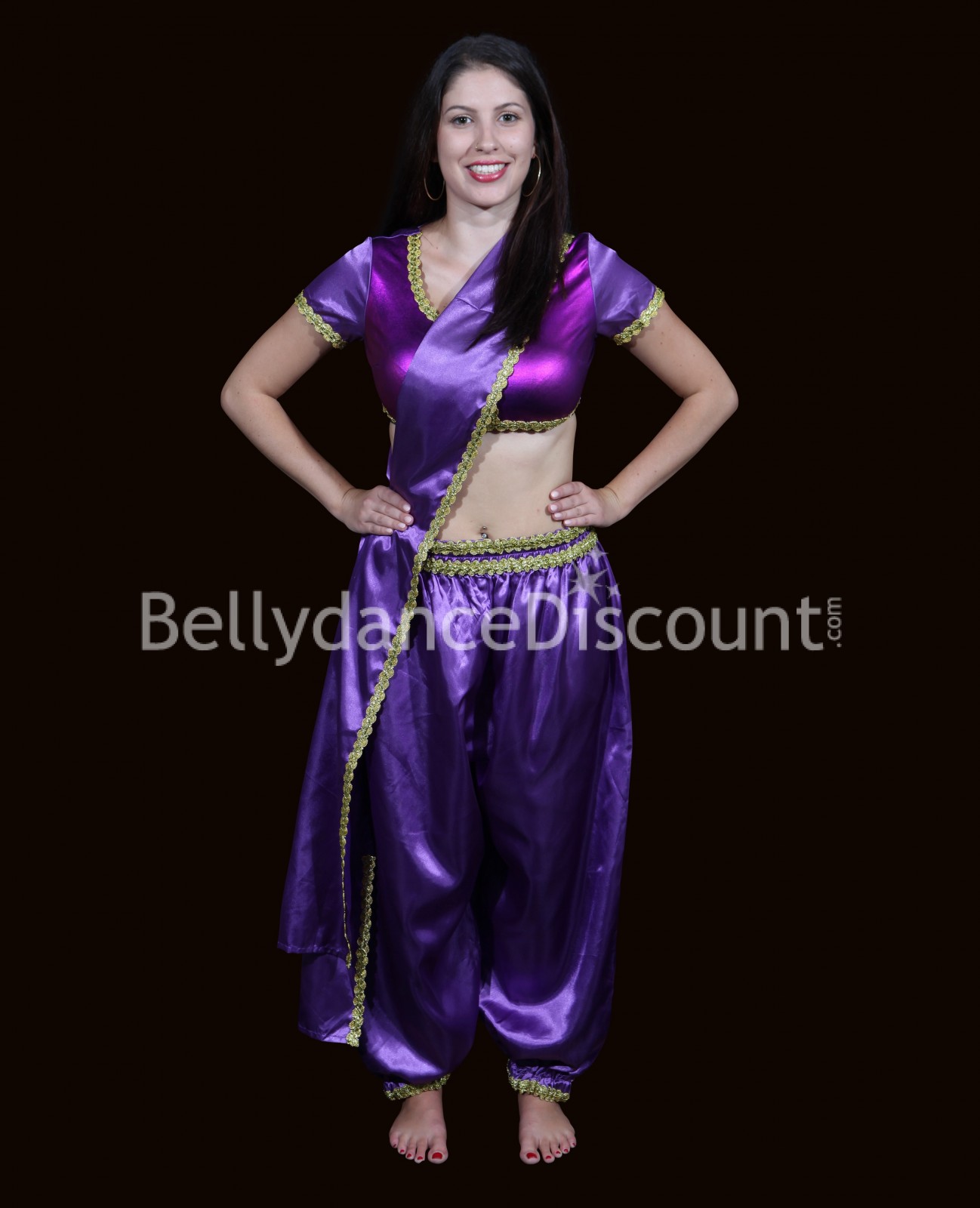 Costume di danza Bollywood in raso viola composto da 1 top + 1 velo da indossare a tracolla + 1 gonna + 1 paio di pantaloni larghi. Il tutto splendidamente decorato con cuciture dorate. Gli abiti sono intercambiabili e Le consentono una moltitudine di look nel rispetto dei codici della moda indiana.
