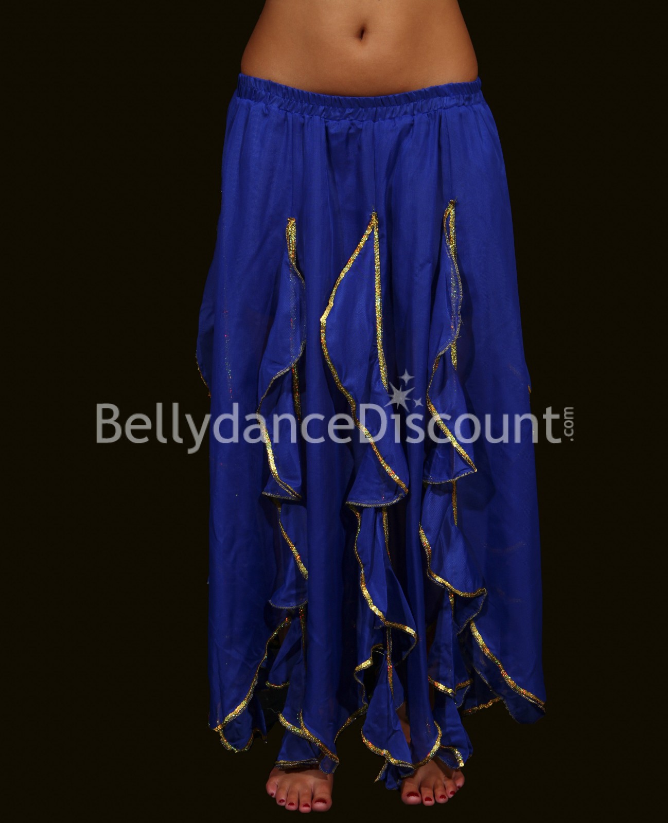 Gonna di danza del ventre elastica al livello della vita, dotata di numerosi volant di tessuti morbidi e decorati con un bordino dorato.
