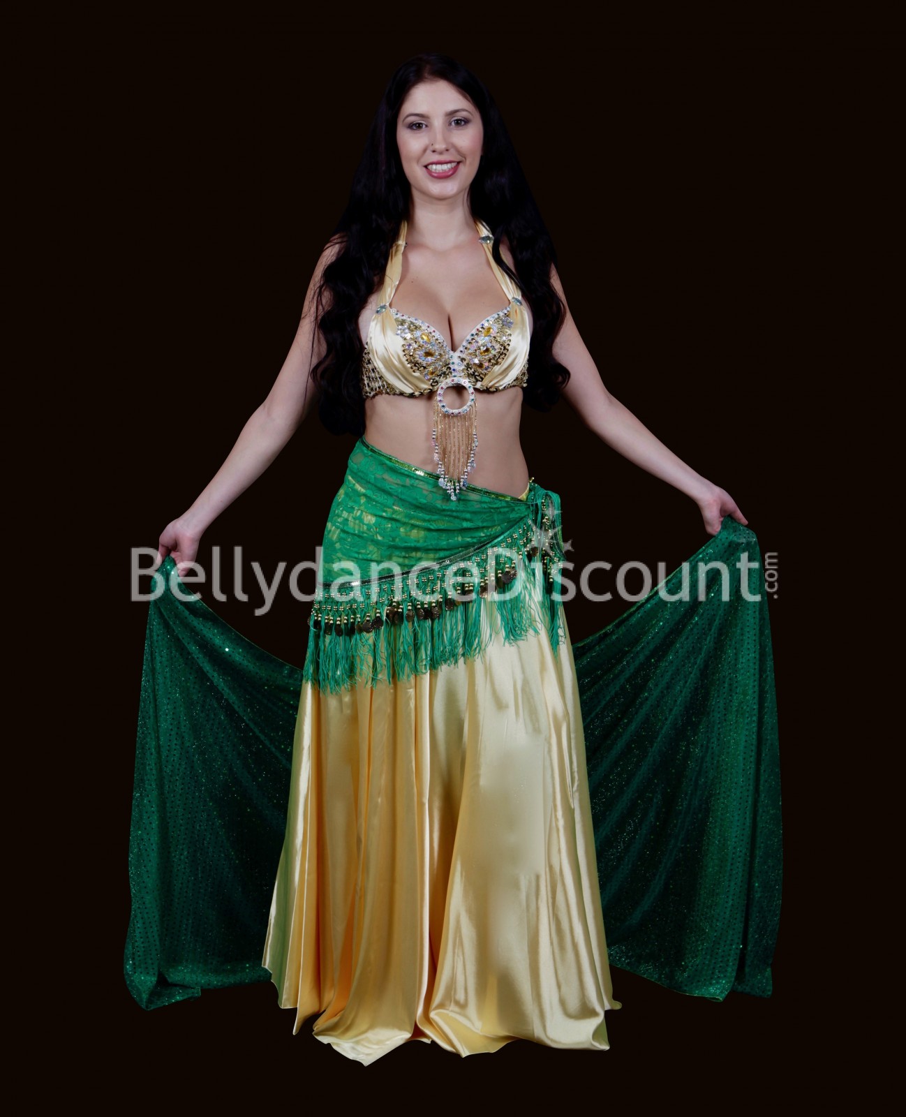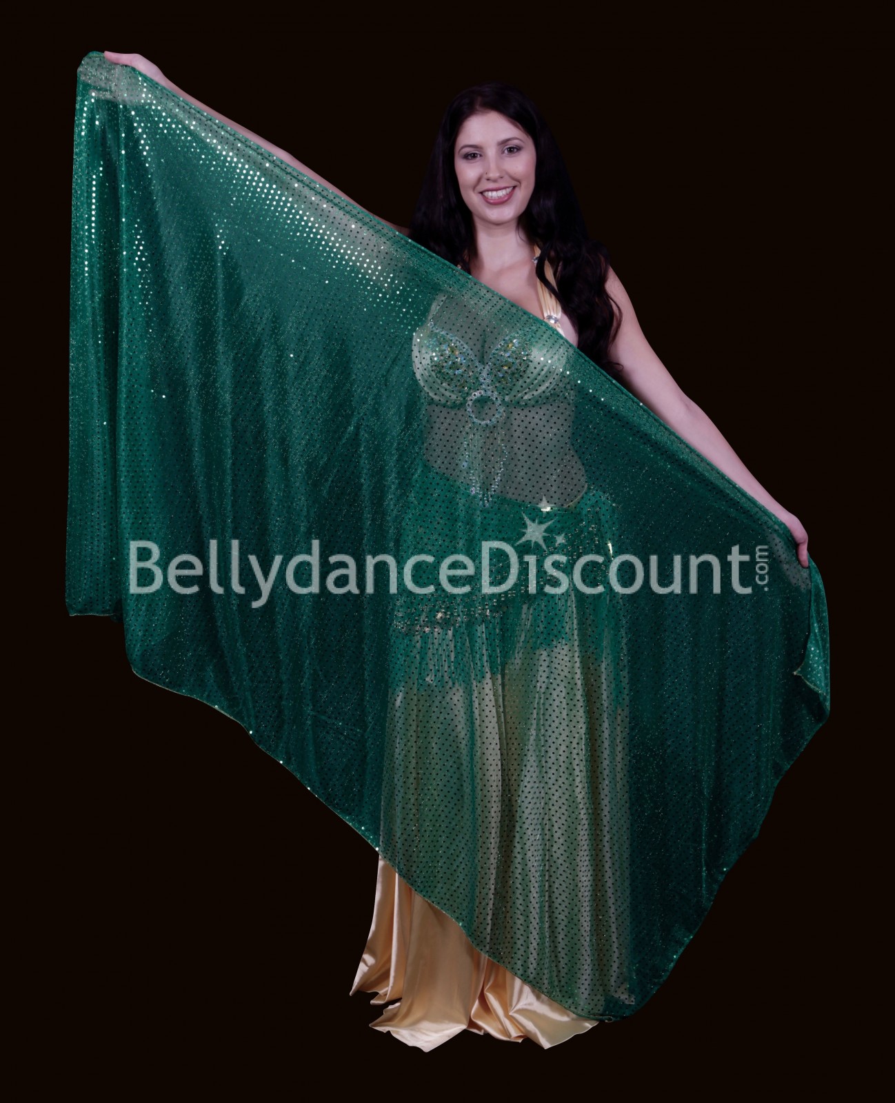 Stupendo velo di danza del ventre in poliestere morbido e leggero, facile da manipolare, interamente coperto di paillettes su un lato.